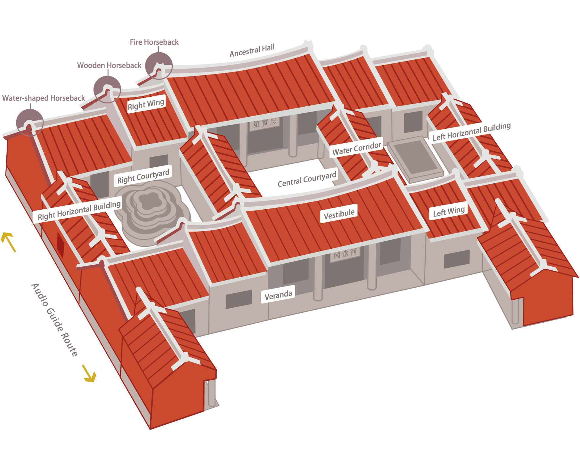 Grandpa Ciou: Think about it. The house’s layout is similar to the Chinese character for the number “four” (四), a rectangular shape. The outermost sections on the left and right are called “horizontal rooms.” The vestibule and the ancestral hall are connected by two walkways called “water corridors."